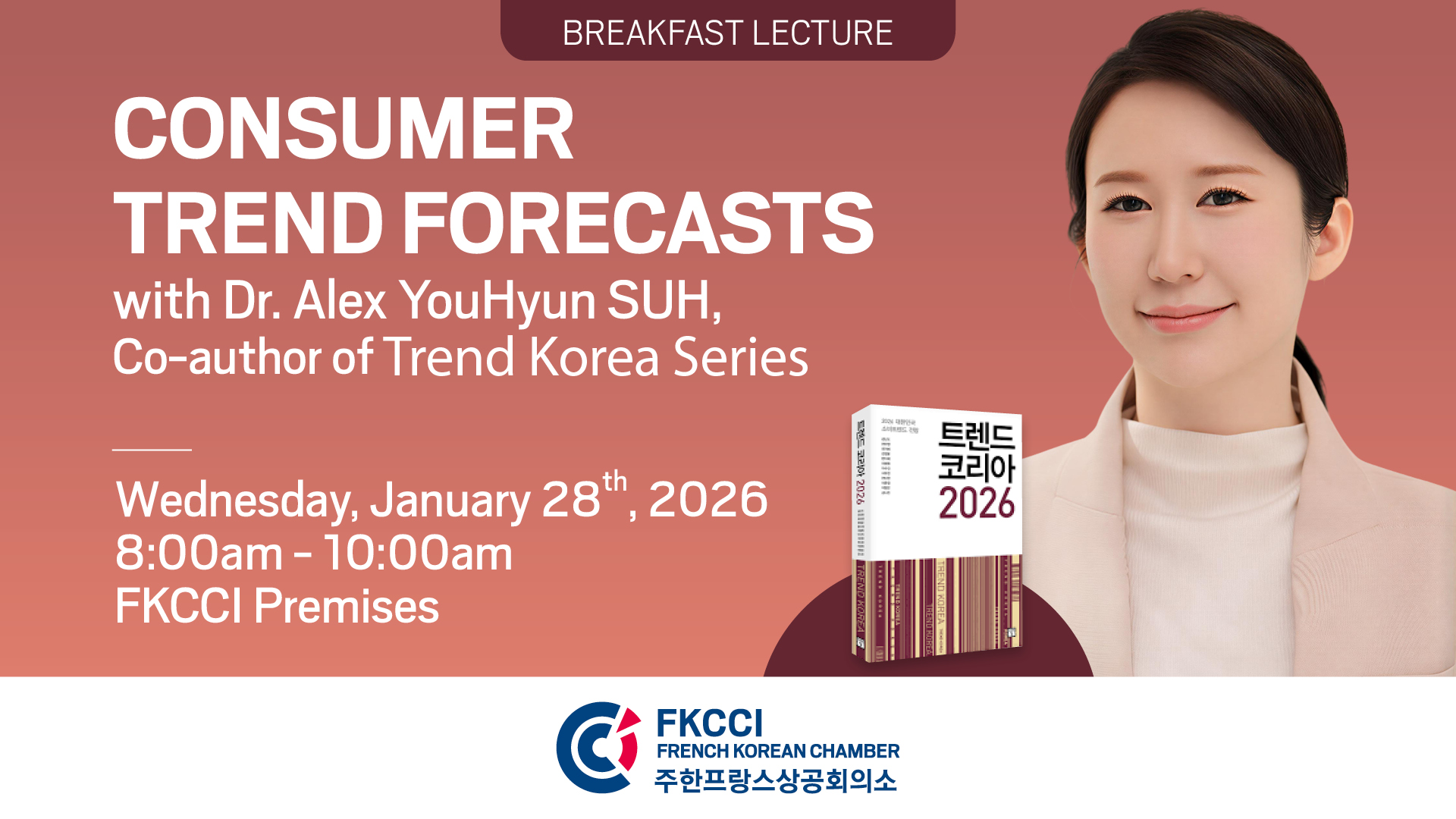 2026년을 맞이한 지금, 변화하는 소비자를 이해할 준비가 되셨나요? FKCCI는 아시아에서 가장 영향력 있는 소비 트렌드 서적 중 하나인 '트렌드 코리아 2026'의 주요 인사이트를 바탕으로 한 특별 조찬 강연 2026 소비자 트렌드 전망 에 여러분을 초대합니다. 본 세션에서는 AI 중심 사회 속에서 소비, 비즈니스 모델, 그리고 의사결정 방식을 재편하고 있는 핵심 동인들을 심층적으로 분석합니다.